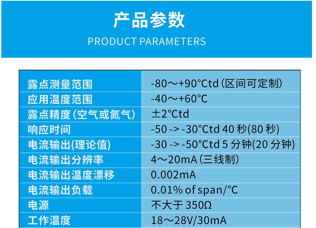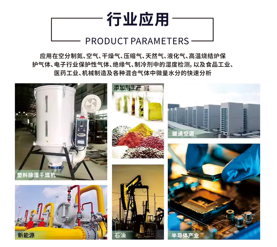 應(yīng)用 : 應(yīng)用在空分制氮、空氣、干燥氣、壓縮氣、天然氣、液 化氣、高溫?zé)Y(jié)爐保護氣體、電子行業(yè)保護性氣體、絕緣氣、制冷劑中的濕度檢測,以及食品工業(yè)、 醫(yī)藥工業(yè)、機械制造及各種混合氣體中微量水分的快速分析