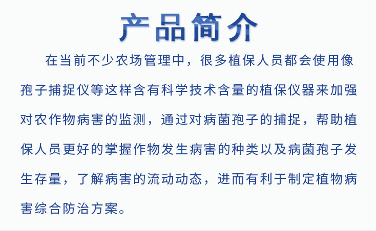 我國危害農作物的重要病害有上百多種,其中很多都是由真菌引起的。一部分真菌病害主要是通過孢子在空氣中傳播對作物進行侵染和再侵染。而對作物周圍環境中的孢子相對密度的監測,孢子捕捉儀成為植物病害預測和防治的重要植保儀器。在當前不少農場管理中,很多植保人員都會使用像孢子捕捉儀等這樣含有科學技術含量的植保儀器來加強對農作物病害的監測,通過對病菌孢子的捕捉,幫助植保人員更好的掌握作物發生病害的種類以及病菌孢子發生存量,了解病害的流動動態,進而有利于制定植物病害綜合防治方案。