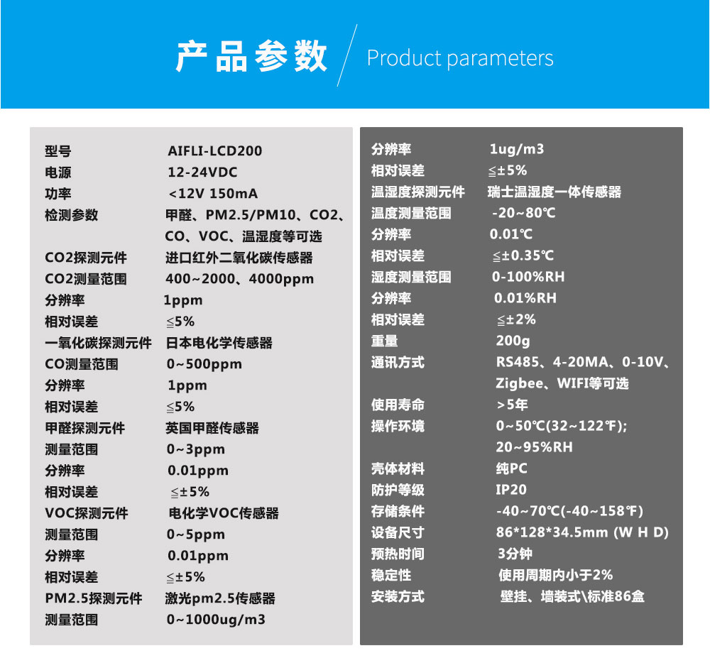 AIFLI-LCD200室內專用環境檢 監測系統終端-壁掛式是一款專門針對家居及公共場所室內環境而定制全面24小時實時在線監測的系統終端設備,可以在手機端、電腦端遠程查看相關監測數據。