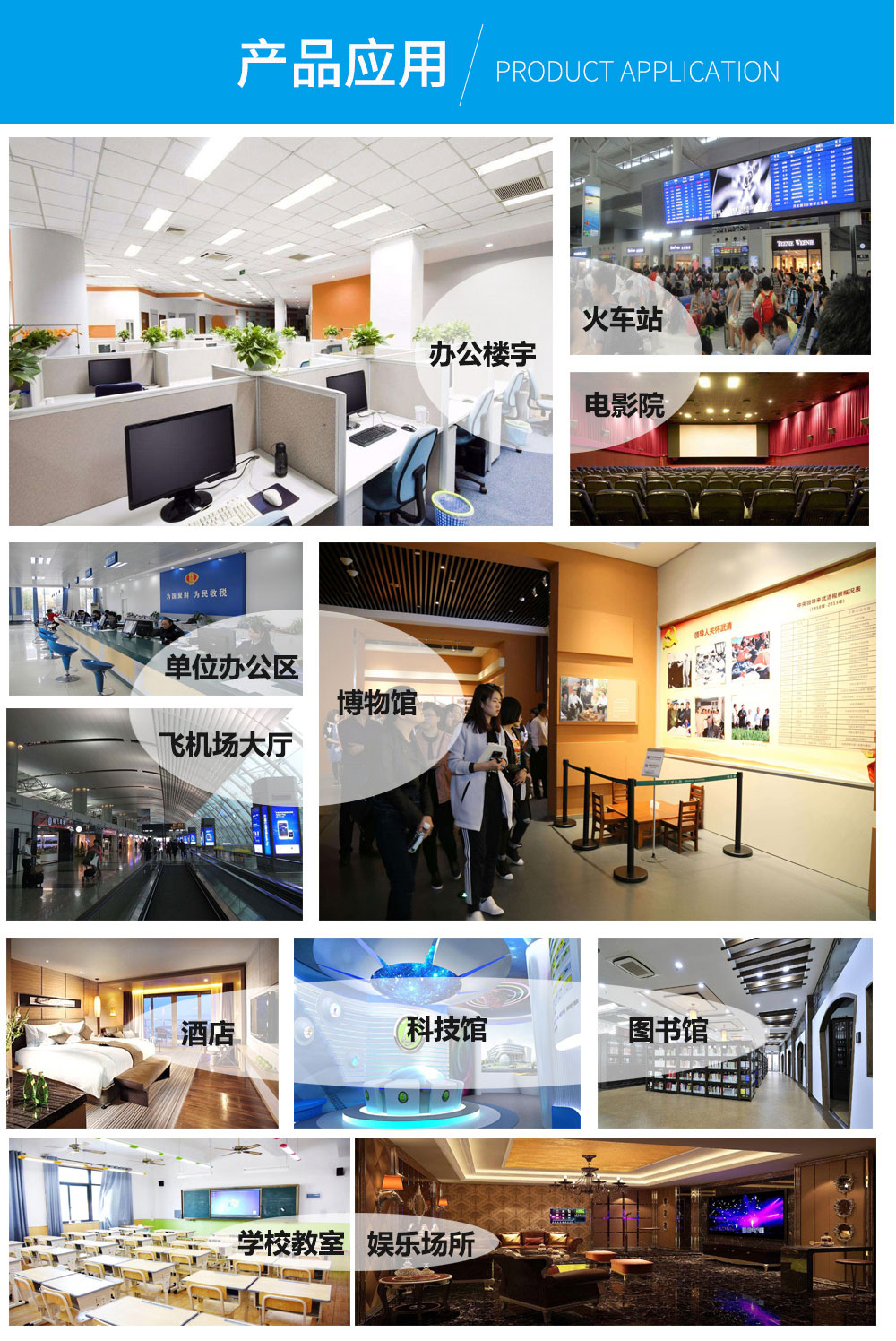 應用 : 可用于住宅、醫院病房、老年建筑、幼兒園、學校教室、辦公樓、旅店、文化娛樂場所、書店、圖書館、展覽館、體育館、商場(店)、公共交通工具等候室、醫院候診室、飯館、理發店等建筑