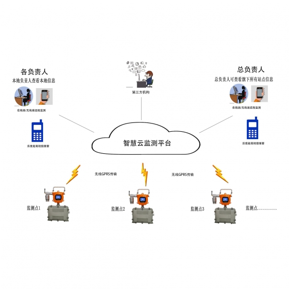 監測點1 23....通過GPRS傳輸到云平臺,管理者可以通過遠程登錄平臺賬號進行查看點位實時濃度檢測,手機或者PC端都可查看;